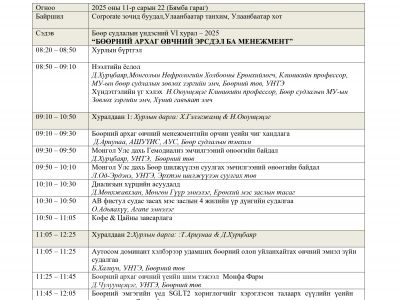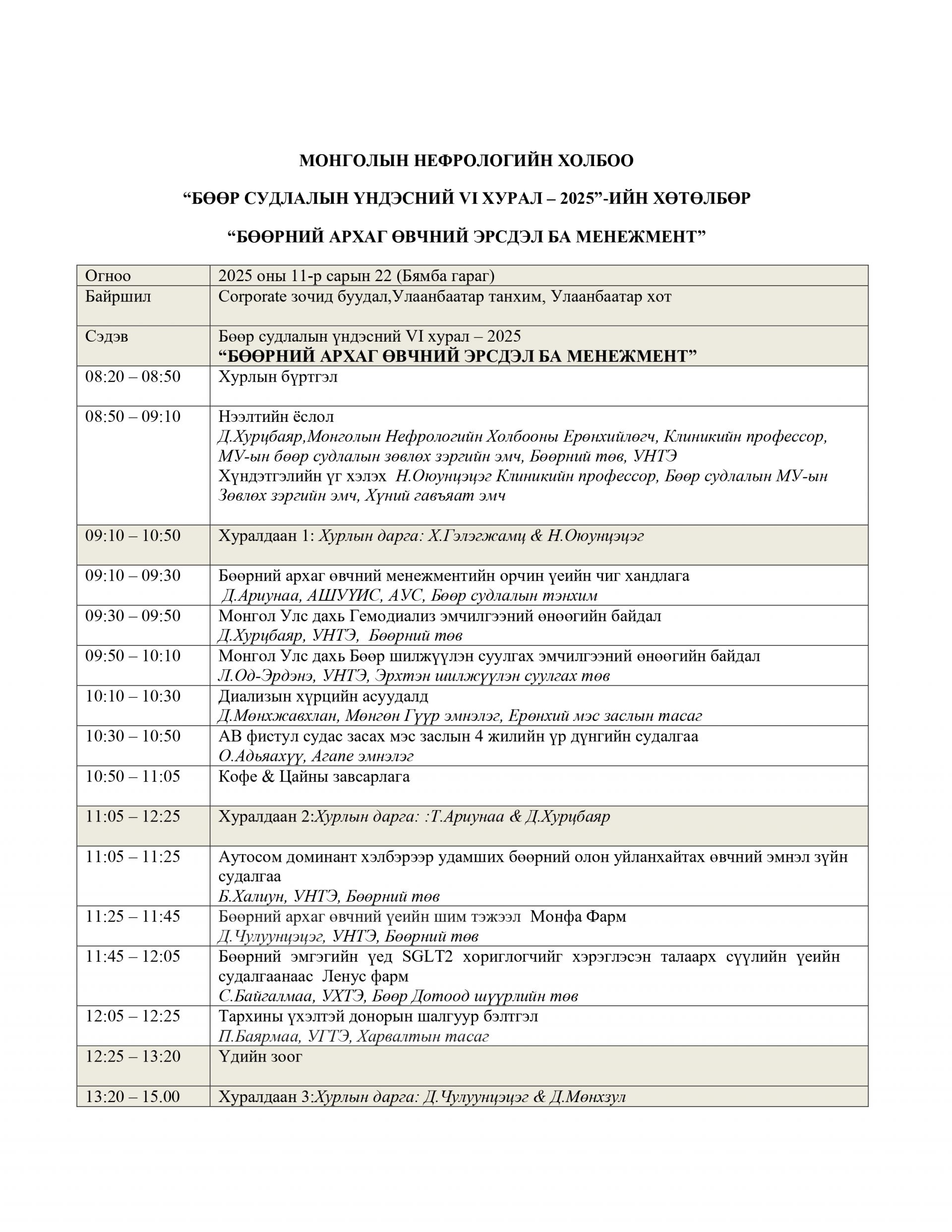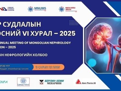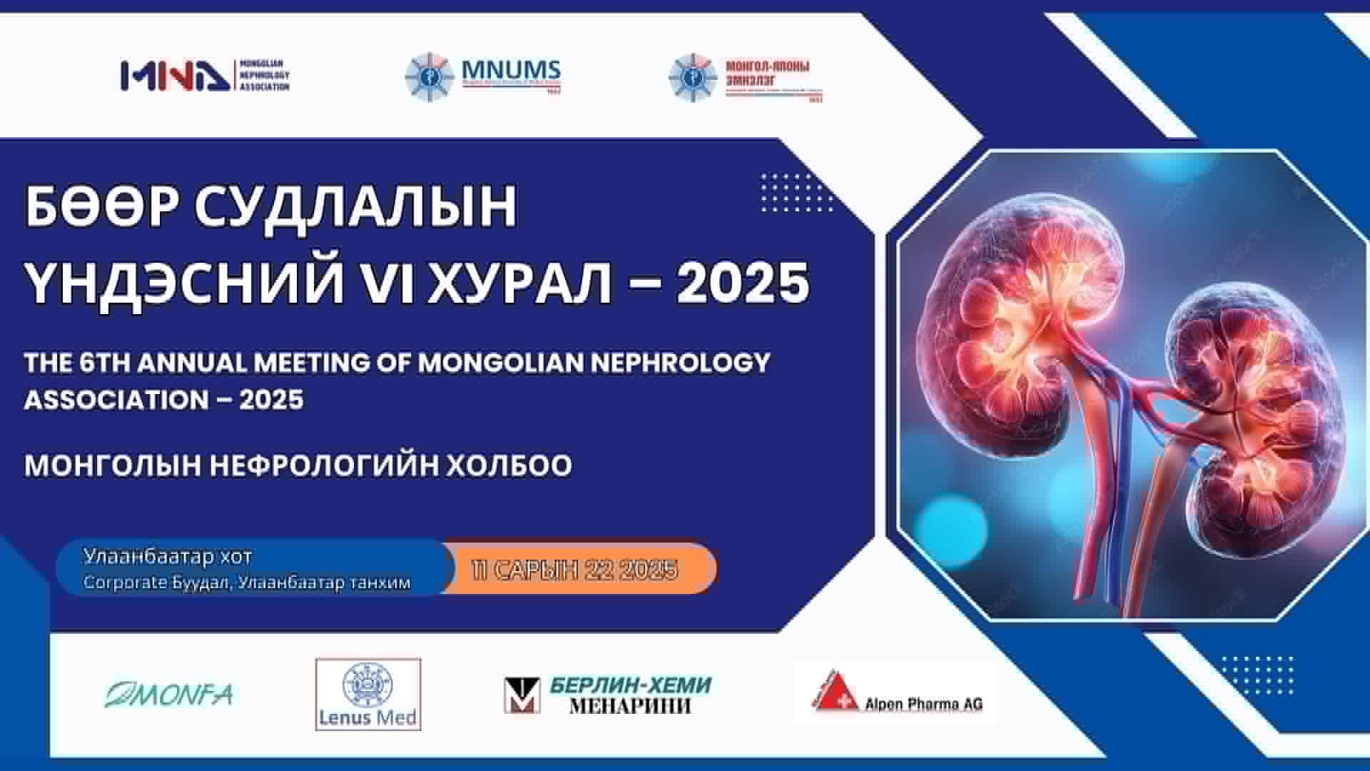 Сайн байцгаана уу,“БӨӨР СУДЛАЛЫН ҮНДЭСНИЙ VI ХУРАЛ – 2025” “БӨӨРНИЙ АРХАГ ӨВЧНИЙ ЭРСДЭЛ БА МЕНЕЖМЕНТ” нэрийн дор 2025 оны 11-р сарын 22 өдөр Бямба гарагт Corporate зочид буудал,Улаанбаатар танхим, Улаанбаатар хотод зохион байгуулагдах гэж байгааг дахин дуулгахад таатай байна.